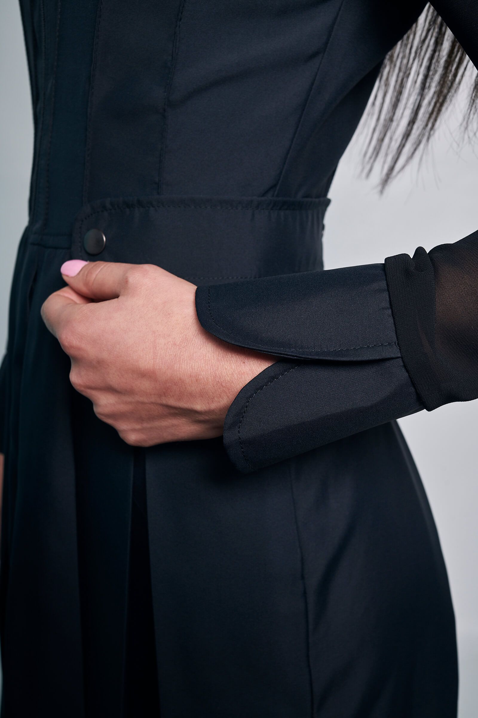 Vestido formal que cuenta con un diseño de pliegues que se extienden de la parte superior y terminan en la falda creando un juego de claro oscuro, negativo y positivo: energías vitales que generan tensión y creatividad; el vestido K-17  tiene un toque sensual al ser corto  y en su  parte superior y mangas tener un velo con transparencia; su cuello es camisero, tiene un cierre delantero y bolsillos al costado.